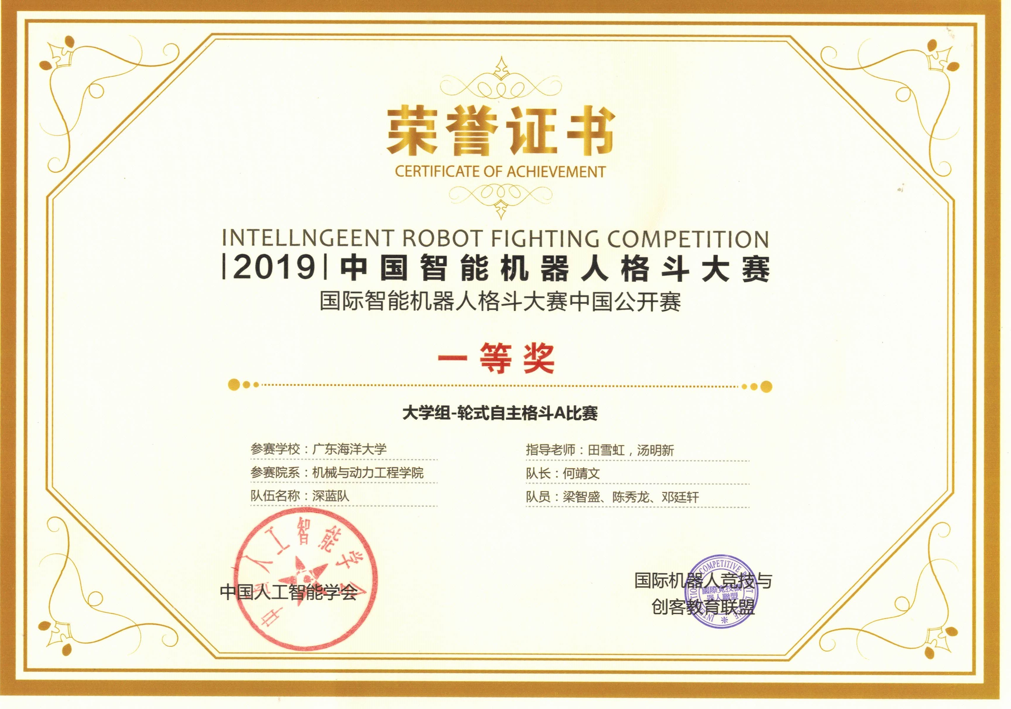 公司机械与动力工程学院的机器人创新团队(深蓝实验室)参加了大学组的轮式自主格斗,在汤明新老师、田雪虹老师的组织与指导下,由何靖文、梁智盛、陈秀龙和邓廷轩4位同学组成的队伍,代表公司参加比赛并获得了全国一等奖的好成绩。