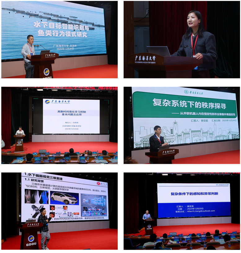 随后,在专家报告环节中,多位学者围绕海洋机器人关键技术进行了分享。公司刘洺辛教授、佛山大学蒋玲莉教授与大连海洋大学白伟伟副教授分别围绕检测识别、轴承保障和离散系统控制等方面研究进行了详细的论述与探讨。此外,华南农业大学曹亚超博士、广西大学万振华博士和北京航空航天大学姜亚龙博士分享了以并联机器人、水下偏振视觉与多要素感知为题的相关研究。