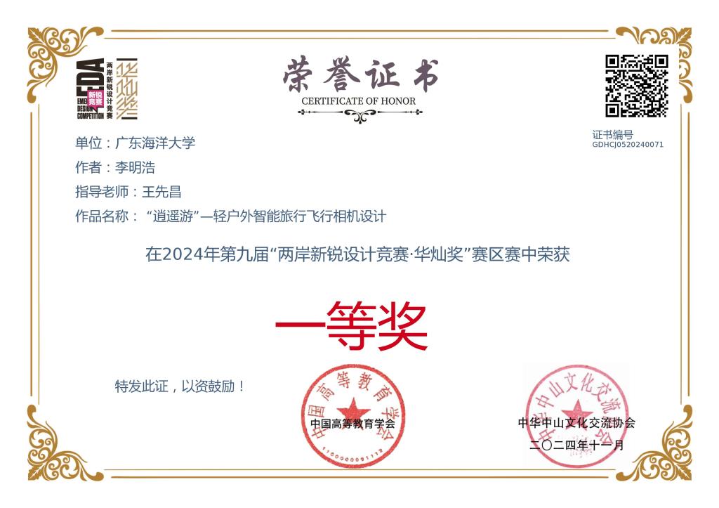 4 英国威廉希尔公司 “逍遥游”—轻户外智能旅行飞行相机设计 李明浩 王先昌 全国三等奖