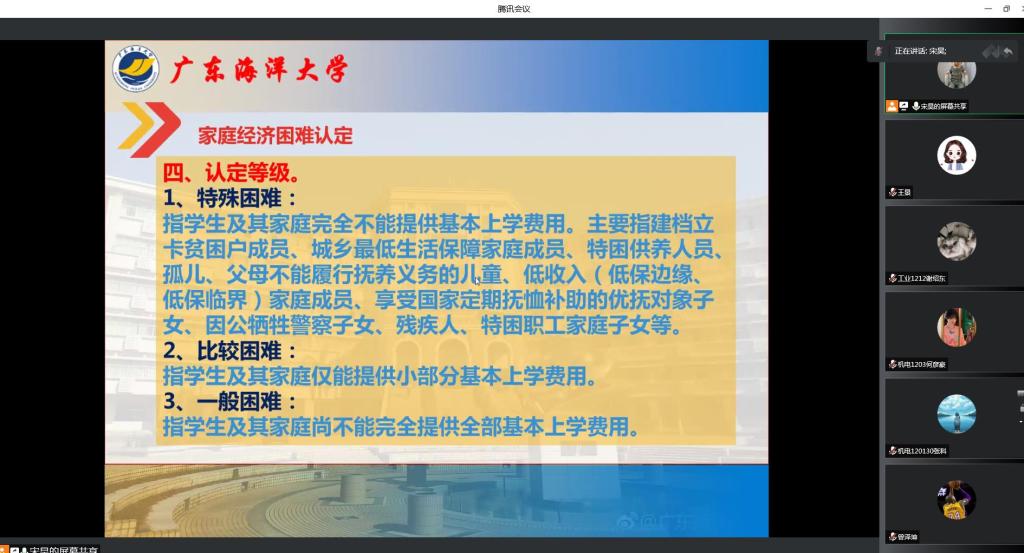 会上,王景老师首先讲解新生“绿色通道”、广东省家庭经济困难大学新生资助、国家助学贷款体系、南粤扶残助学工程以及学校其他资助措施如优秀员工奖学金、勤工助学、临时困难补助、家庭经济困难毕业生就业补助金等,重点强调生源地信用助学贷款的意义和重要性,提醒大一、大二低年级员工及时申请勤工助学岗位。宋昊老师讲解家庭经济困难认定的流程、本科生国家奖助学金、学校社会奖助学金、学费补偿(含“三支一扶”国家助学贷款代偿、高校毕业生到农村从教上岗退费、高校老员工应征入伍学费补偿和国家助学贷款代偿及退役复学后学费减免)等,强调家庭经济困难认定的重要性及学院2022年家庭经济困难认定工作安排。