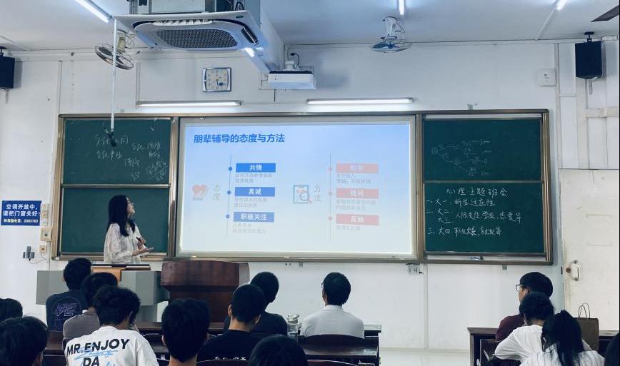 培训围绕“有‘朋’之名,‘辈’感温暖”为中心展开,余芬老师带领参会员工首先明晰了心理委员、宿舍长的职责定位和工作优势,通过生动的案例分析和现场互动,重点从朋辈心理辅导的基本态度、工作技巧、常见心理问题和心理危机的识别与报告等三个方面讲述了朋辈心理工作中的要点、难点及应对方式。强调朋辈心理工作应做到真诚、共情、积极关注,注重在日常生活中的细心观察与耐心倾听,处处留“心”,争取能够给予求助者更大的帮助。在场的心理委员、宿舍长们认真聆听,在做好培训笔记的同时积极参与其中,起到了良好的培训效果。