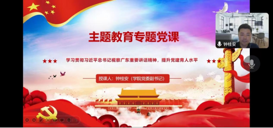 在题为《学习贯彻习近平总书记视察广东重要讲话精神,提升党建育人水平》的专题党课中,钟桂安结合学院高质量发展目标,强调了在学院开展学习贯彻习近平新时代中国特色社会主义思想主题教育的重要性,紧密结合学习和调研成果,分享了学习贯彻习近平新时代中国特色社会主义思想,特别是习近平总书记视察广东重要讲话重要指示精神的认识体会,针对学院员工就业、学风建设、创新创业、员工心理健康等员工工作实际情况,提出了指导实践、推进工作的思路措施。要求学院学工队伍和党员干部要在以学铸魂、以学增智、以学正风、以学促干上下功夫见实效,坚持学思想、强党性、重实践、建新功。
