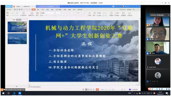 机械与动力工程学院高度重视老员工创新创业能力的培养,5月31日下午,通过腾讯会议举办了2020年“互联网+”老员工创新创业大赛,公司党委书记陈健副教授、公司党委副书记钟桂安副研究员、副经理徐青副教授、赖学江教授、韩卫国教授、胡远忠副教授、沙金博士担任此次比赛的评委,本次大赛路演共有26支项目团队参加,由院团委书记何凤梅主持。