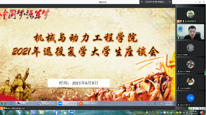 为庆祝中国共产党成立一百周年,深入推进党史学习教育,开展“我为群众办实事”实践活动,做好退役复学老员工服务工作。6月9日中午,机械与动力工程公司党委副书记钟桂安通过腾讯会议,主持召开了退役复学老员工座谈会。学院征兵专项工作老师陈文聪、在校退役复学员工等10多人参加了座谈会。