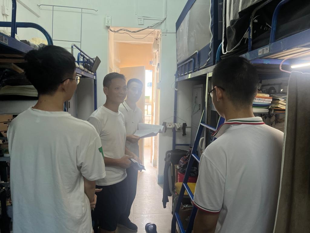 在走访检查宿舍过程中,公司党委副书记梁吉霖和全体辅导员老师与同学亲切交谈并就暑期留校员工安全重点叮嘱。一是强调宿舍安全相关事宜,提醒大家注意防火防电防溺水、谨防诈骗,强调禁止使用违规电器,禁止在宿舍、实验室等场所给电动车电瓶进行充电;二是叮嘱员工要维护宿舍卫生环境,保持宿舍内务整洁,加强文明宿舍创建;三是叮嘱同学们在假期过程中注意劳逸结合,合理安排考研复习、科研和竞赛任务;四是叮嘱同学们做到文明上网、模范遵守学校规章制度;五是叮嘱同学们关注并做好台风防御。
